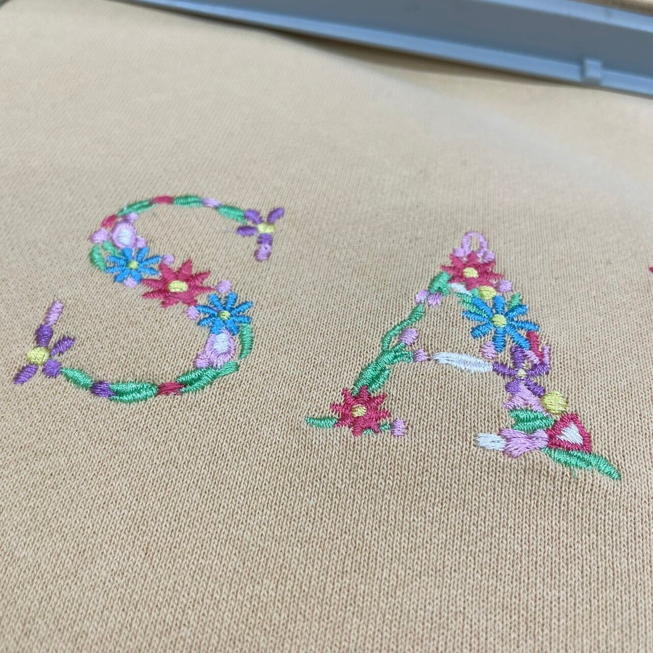 ひと文字ずつ丁寧にデザインされたフラワーレター刺繍スウェットです。