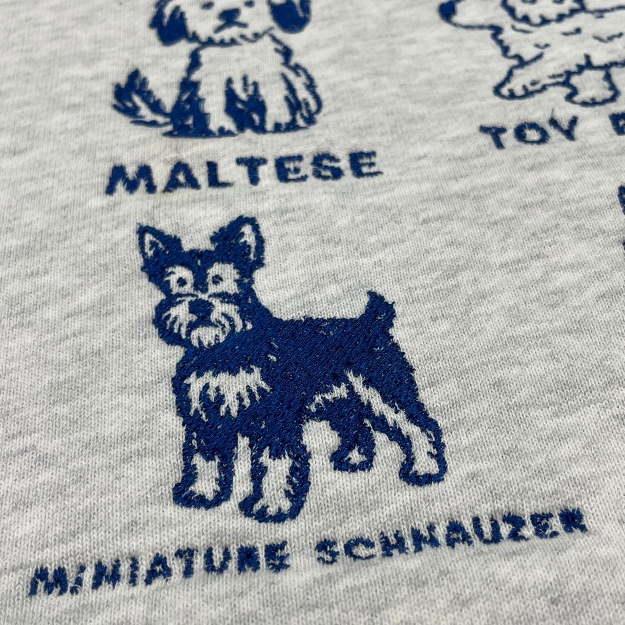 やさしいタッチの6匹の犬の刺繍を胸元にあしらった特別バージョンのトレーナーです。