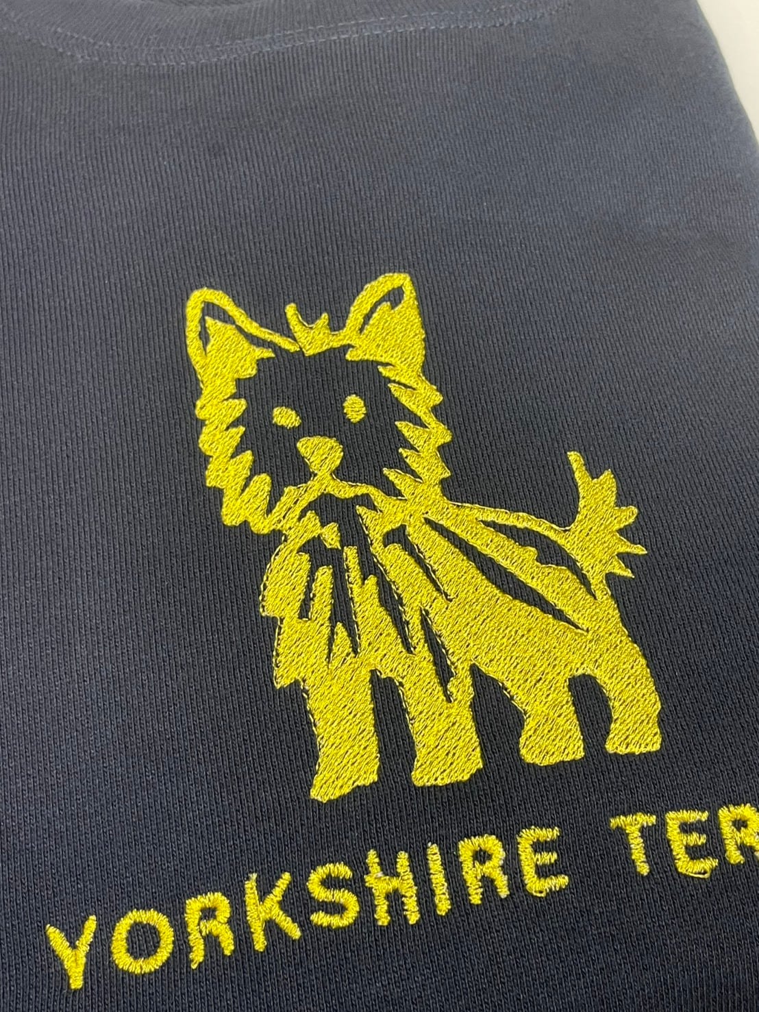 ※完全1点ものです。ヨークシャテリアの絵本風刺繍がデザインされています。