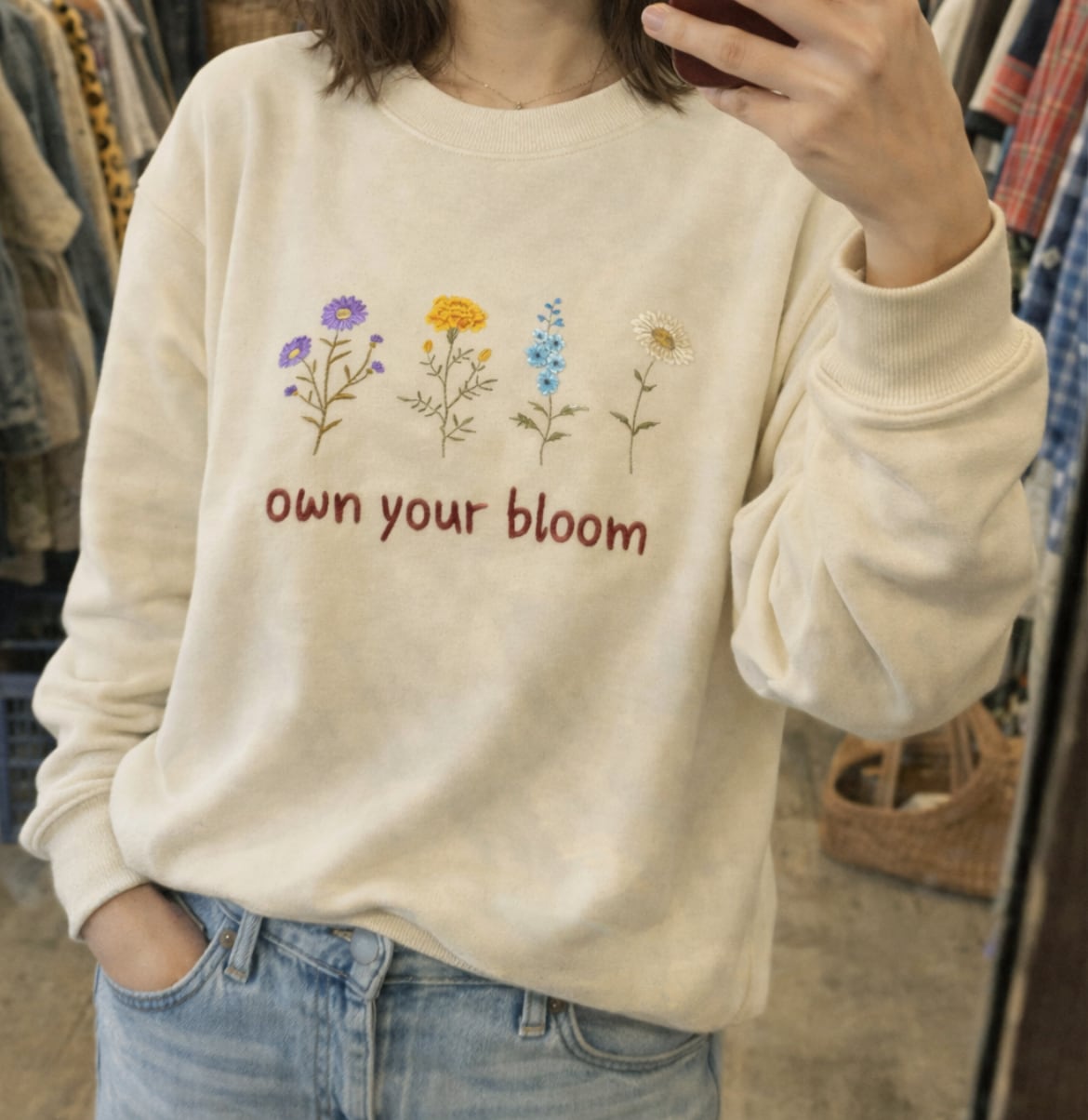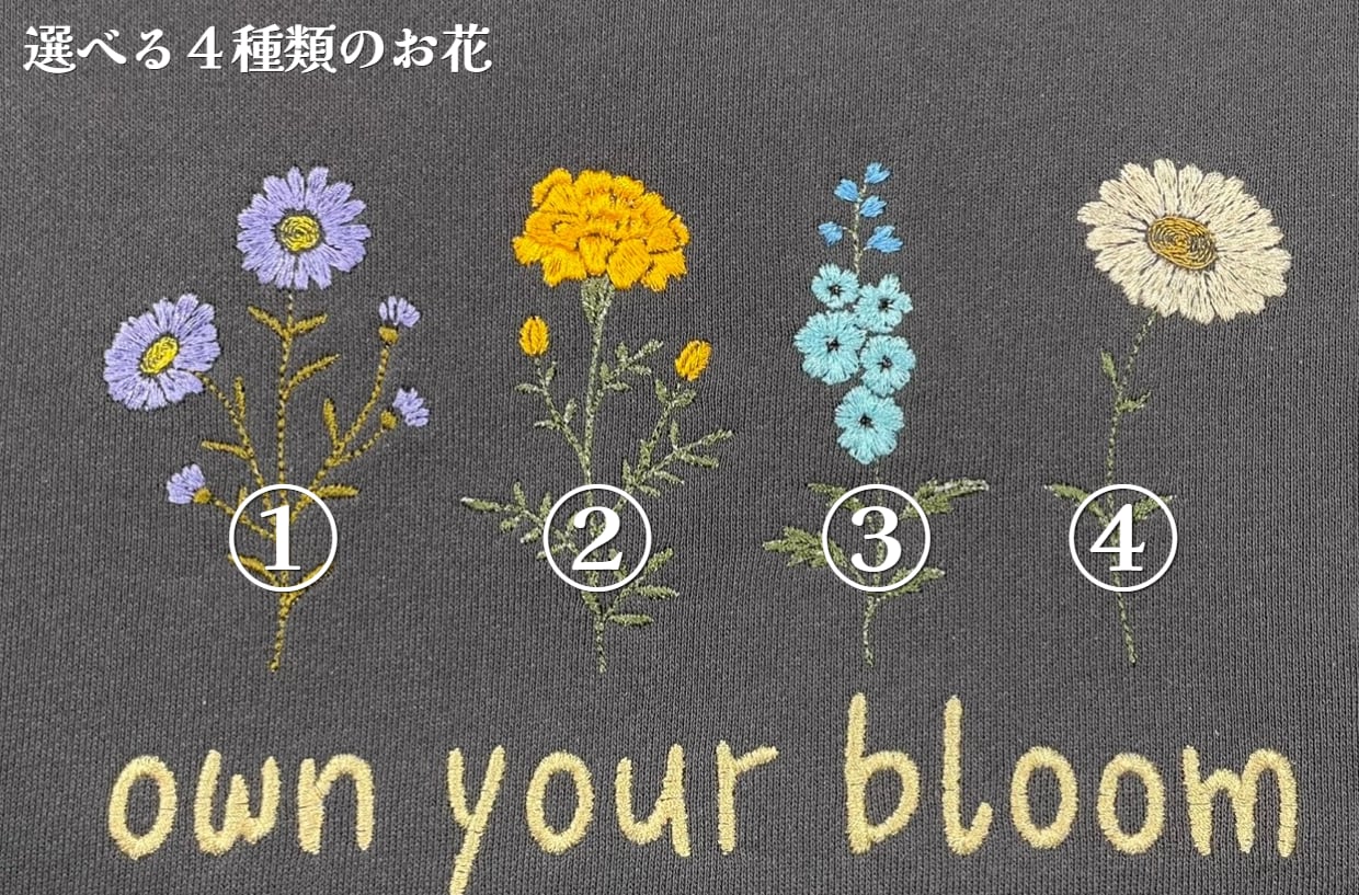 花と一緒に own your bloom(自分らしく、咲く) という文字が刺繍されます。