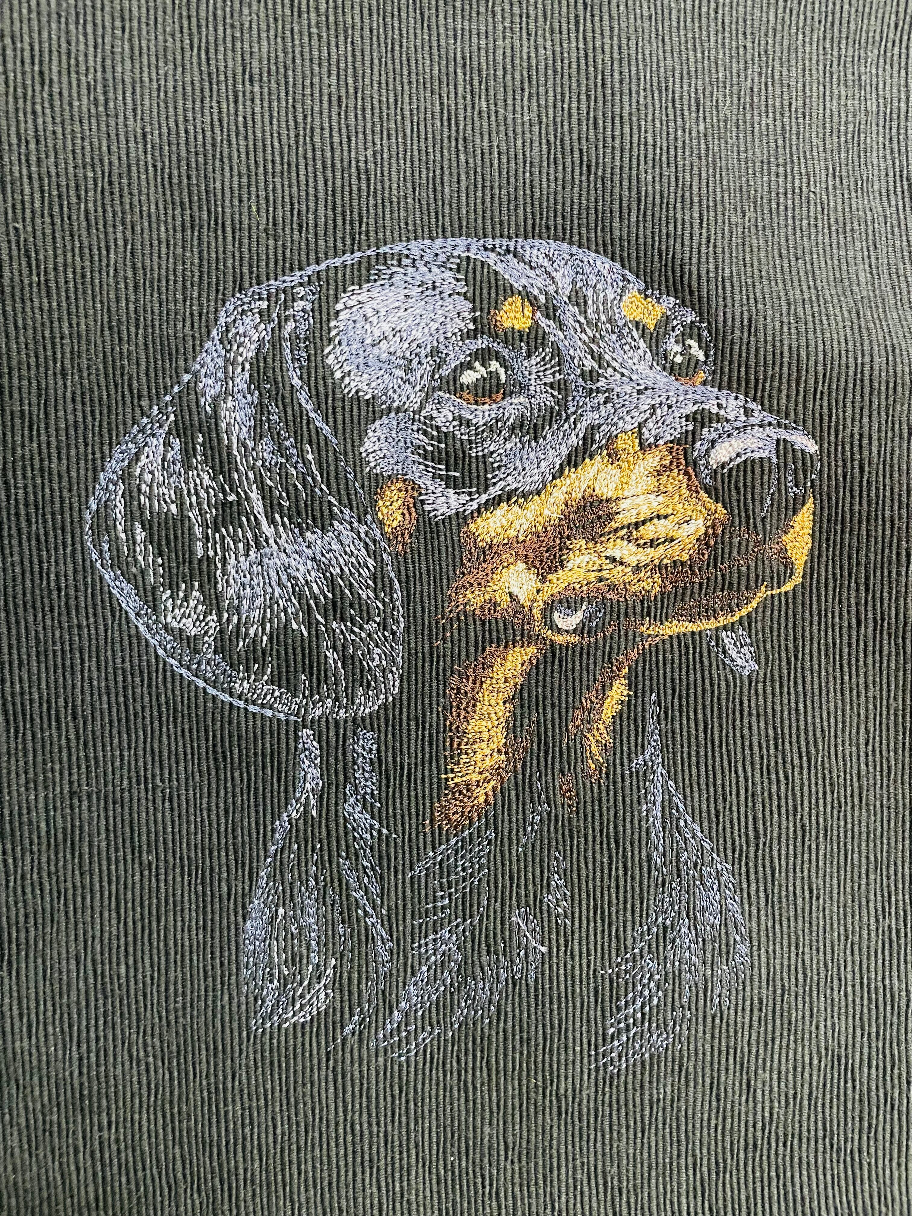 ダックスフンドの美しい表情をリアルに刺繍で表現しました。