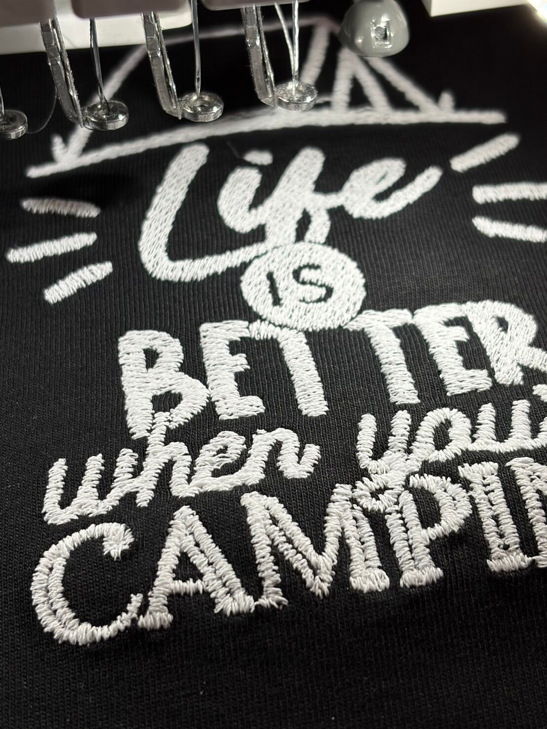 キャンプをモチーフにした線画デザインに、蓄光糸を使用した一枚です。