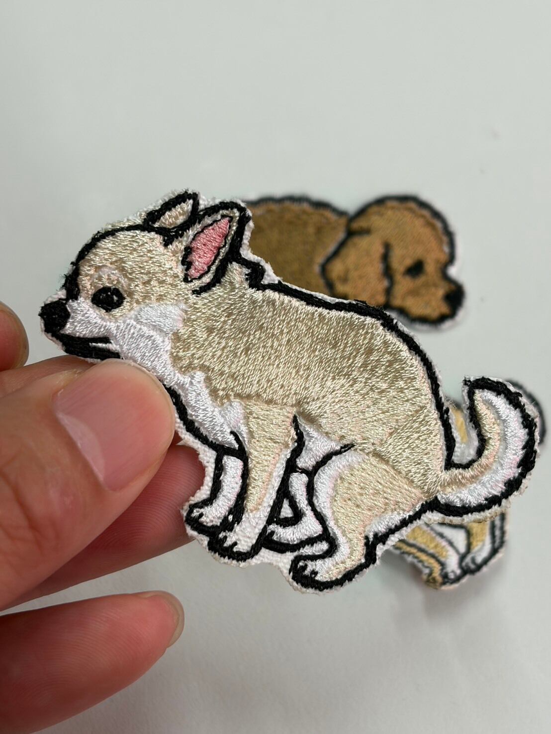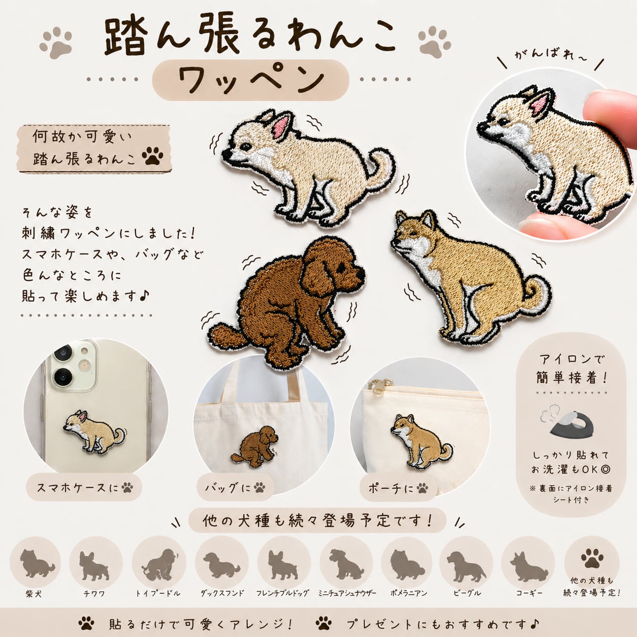 思わずクスッとなる「踏ん張るワンこ」をモチーフにした刺繍ワッペンです。